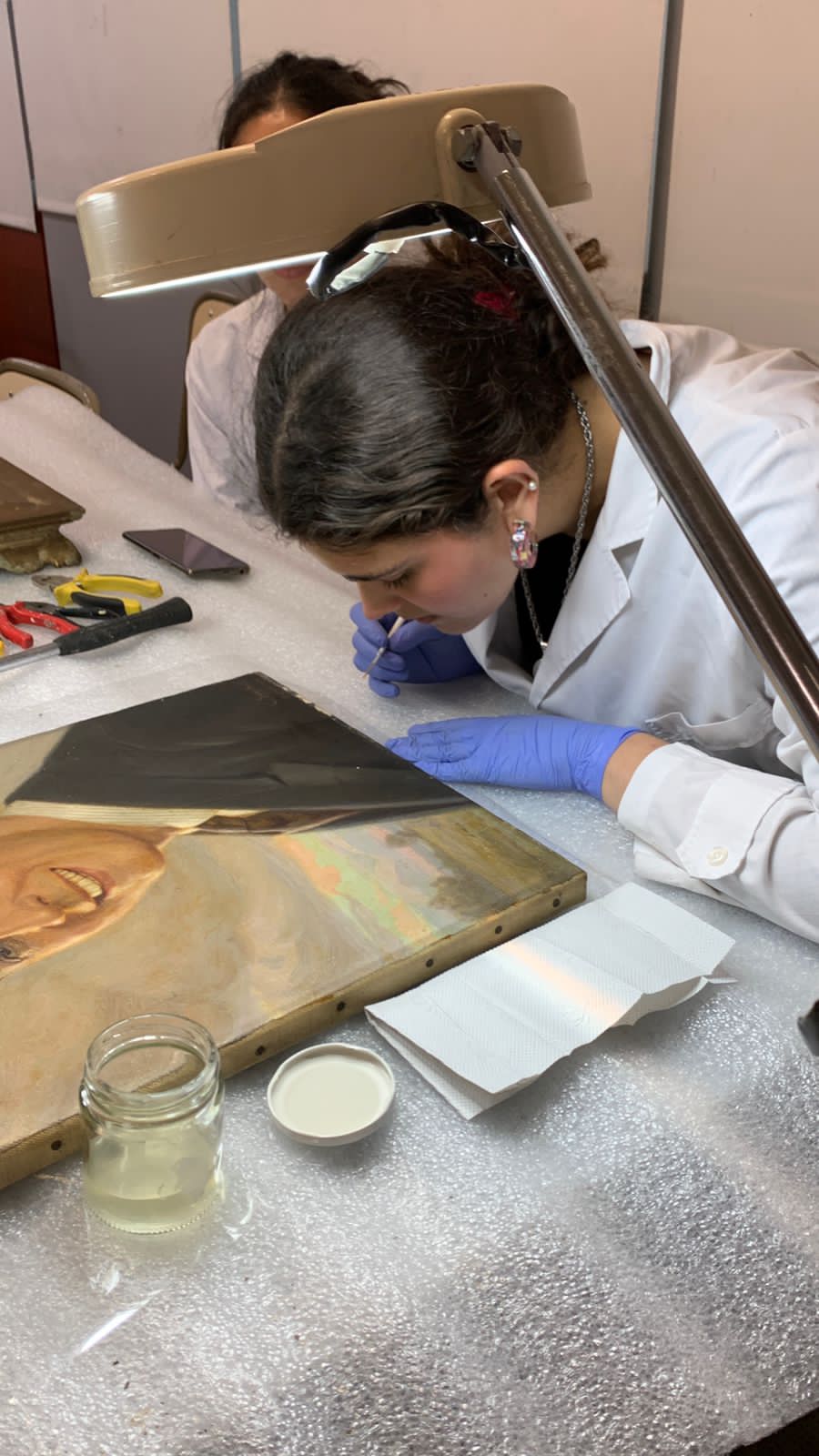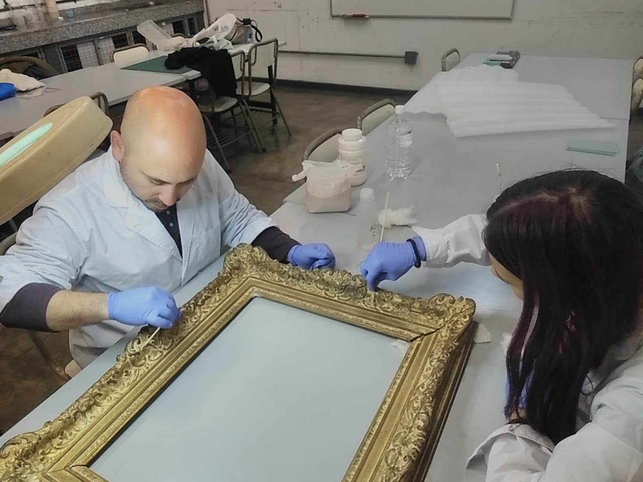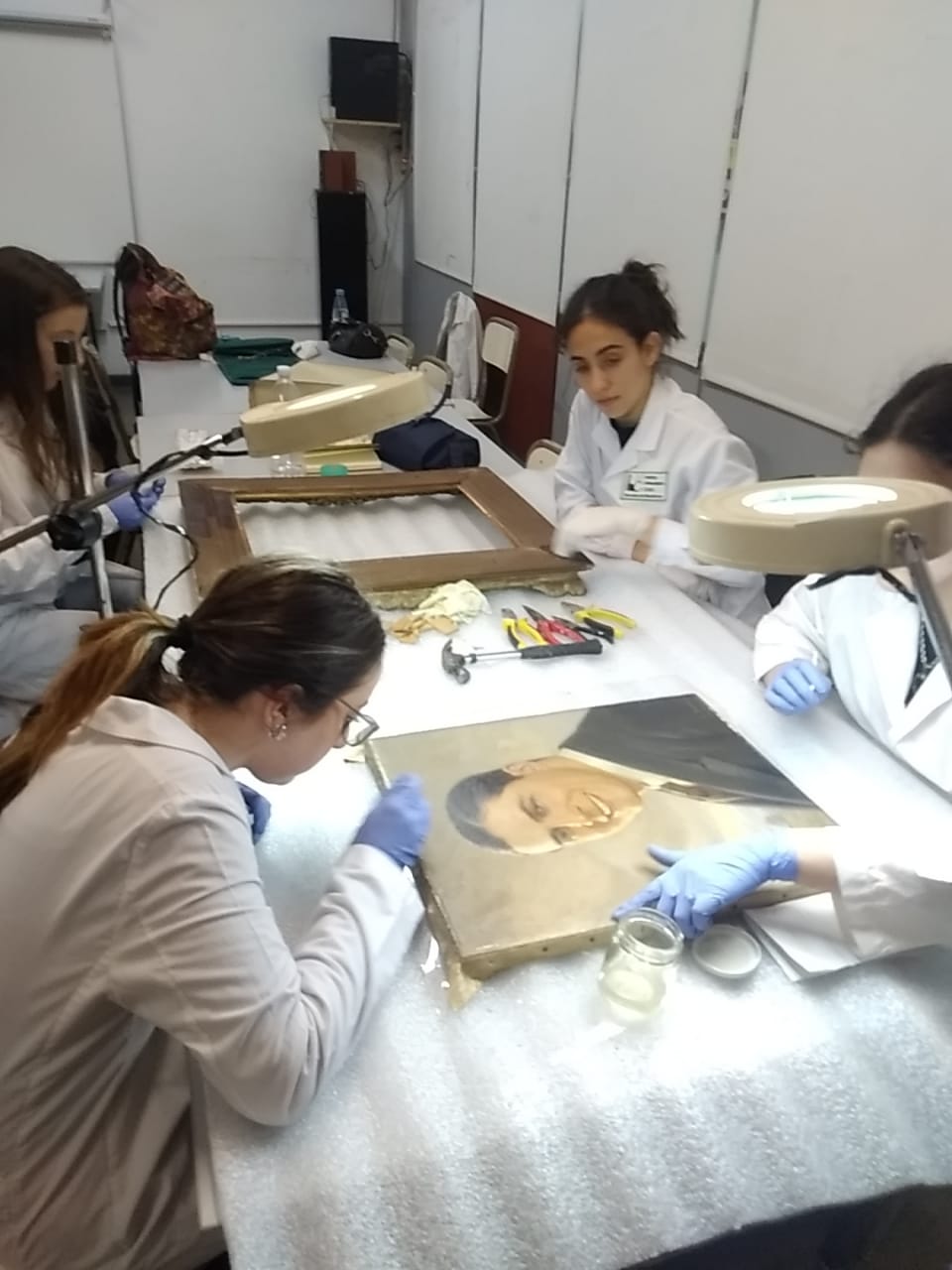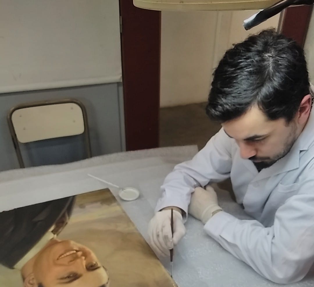 Alumnos de 2do. Año de la carrera de Conservación y Restauración de Bienes Culturales bajo la dirección de la Prof. Mag. Vilma Perez Casalet interviniendo una pintura perteneciente a la colección de Casa del Teatro para la noche de los Museos.
