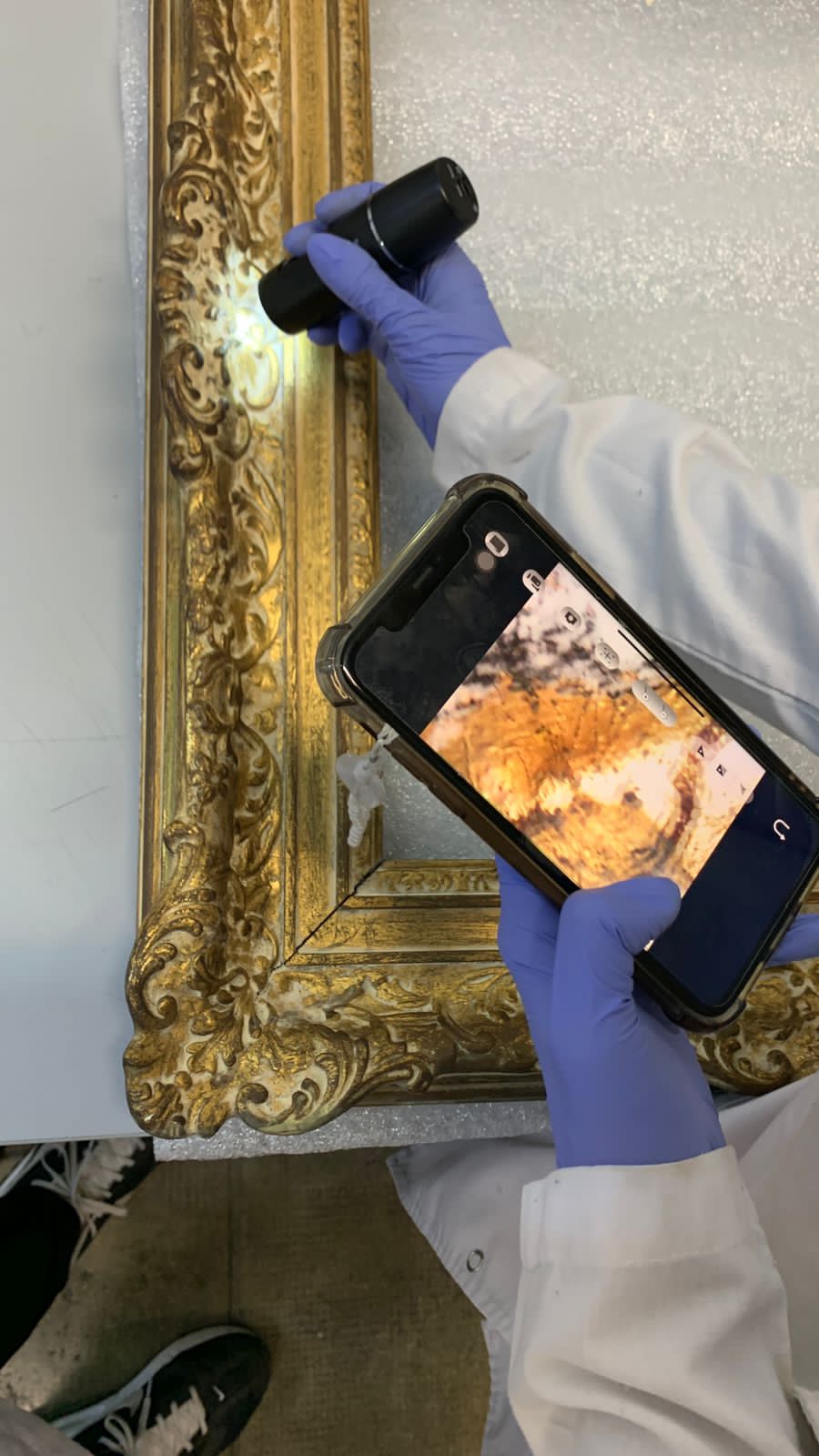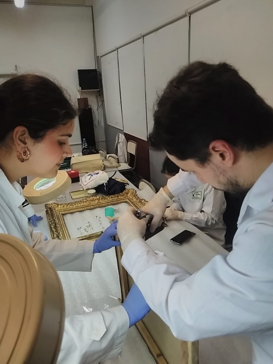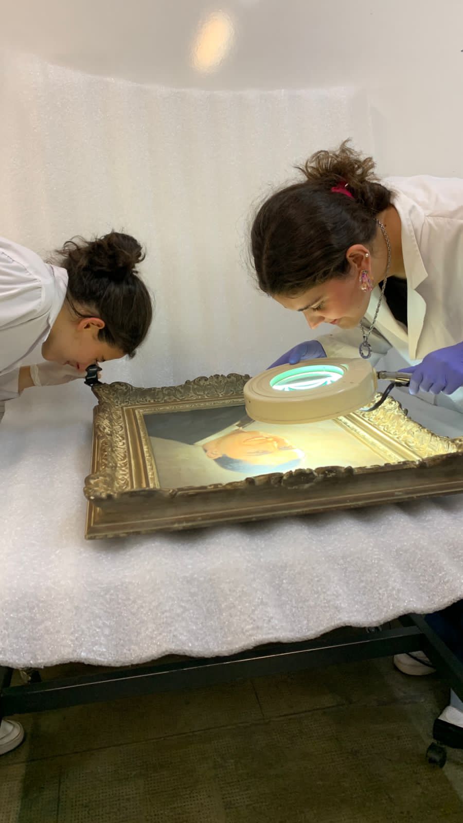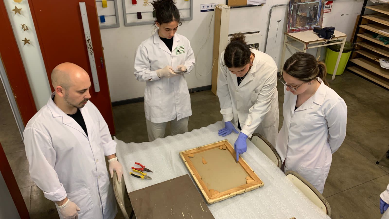 Alumnos de 2do. Año de la carrera de Conservación y Restauración de Bienes Culturales bajo la dirección de la Prof. Mag. Vilma Perez Casalet interviniendo una pintura perteneciente a la colección de Casa del Teatro para la noche de los Museos.