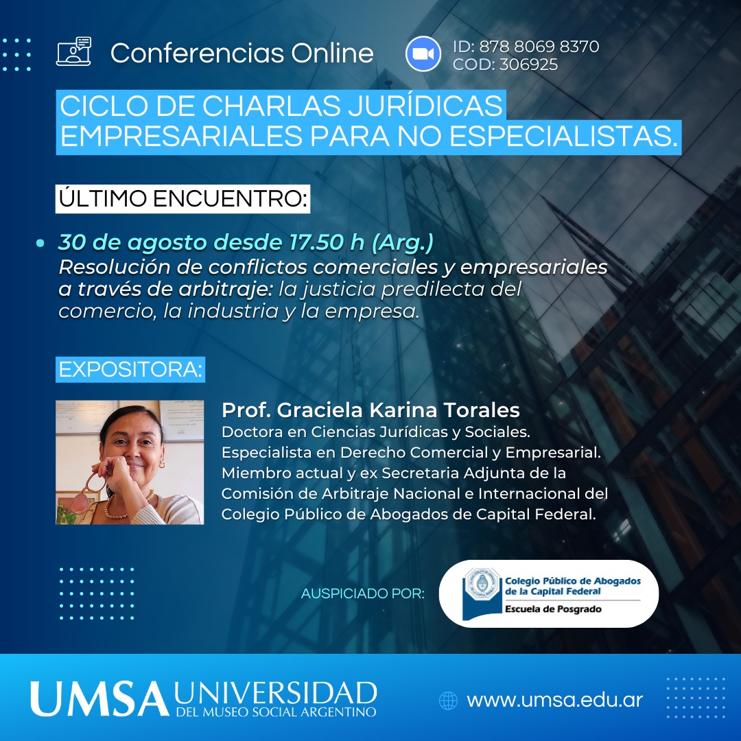 Finalmente, en la tercera y última charla de este ciclo, hablaremos de algo fundamental que es la Resolución de Conflictos mediante Arbitraje Comercial. Siendo éste un método ancestralmente conectado con el Comercio y, con grandes beneficios en la actualidad.
