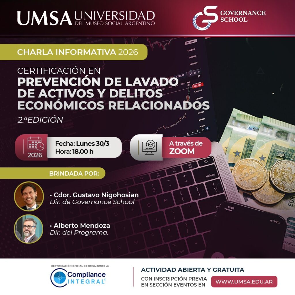 Participá de la charla informativa de la Certificación en Prevención de Lavado de Activos, una propuesta académica orientada a profesionales que buscan especializarse en compliance, regulación financiera y prevención de delitos económicos.