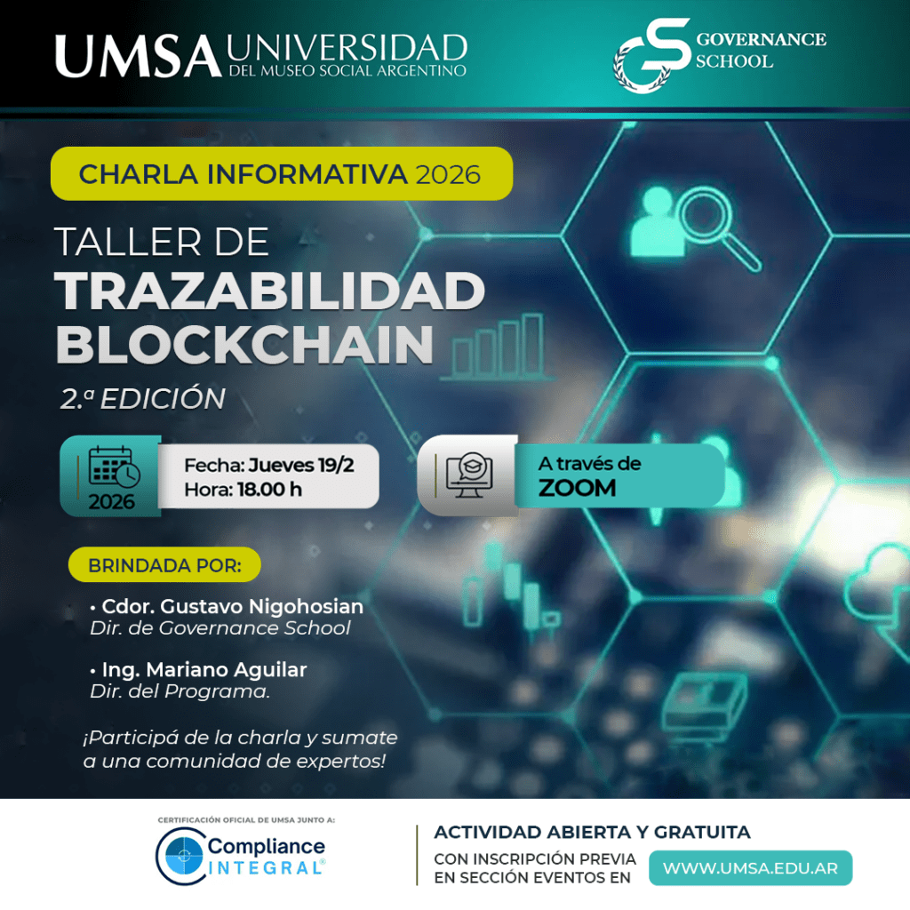 La Universidad del Museo Social Argentino, a través de Governance School, invita a participar de la Charla Informativa del Taller de Trazabilidad Blockchain, una propuesta académica orientada a la formación en tecnologías aplicadas a procesos de trazabilidad, auditoría y compliance.