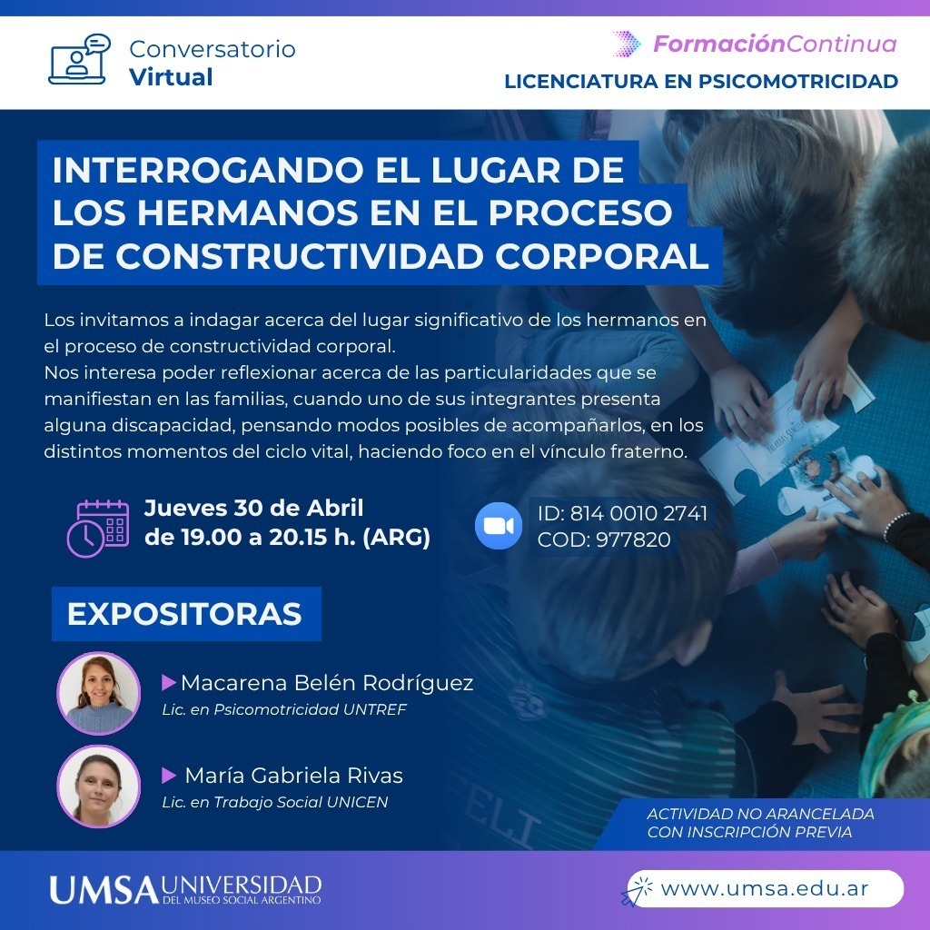En el marco de la Licenciatura en Psicomotricidad, este conversatorio virtual propone un espacio de reflexión e intercambio en torno al rol de los hermanos en el proceso de constructividad corporal, con especial foco en el desarrollo subjetivo y vincular en la infancia.