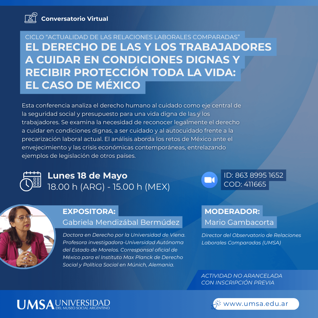 La actividad contará con la exposición de Dra. Gabriela Mendizábal Bermúdez, doctora en Derecho por la Universidad de Viena y profesora investigadora de la Universidad Autónoma del Estado de Morelos. La moderación estará a cargo de Mario Gambacorta, director del Observatorio de Relaciones Laborales Comparadas de UMSA.