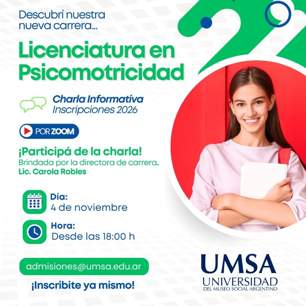 📌 Te esperamos en la Charla Informativa Online sobre la carrera de Psicomotricidad en UMSA, brindada por su Directora, la Lic. Carola Robles.