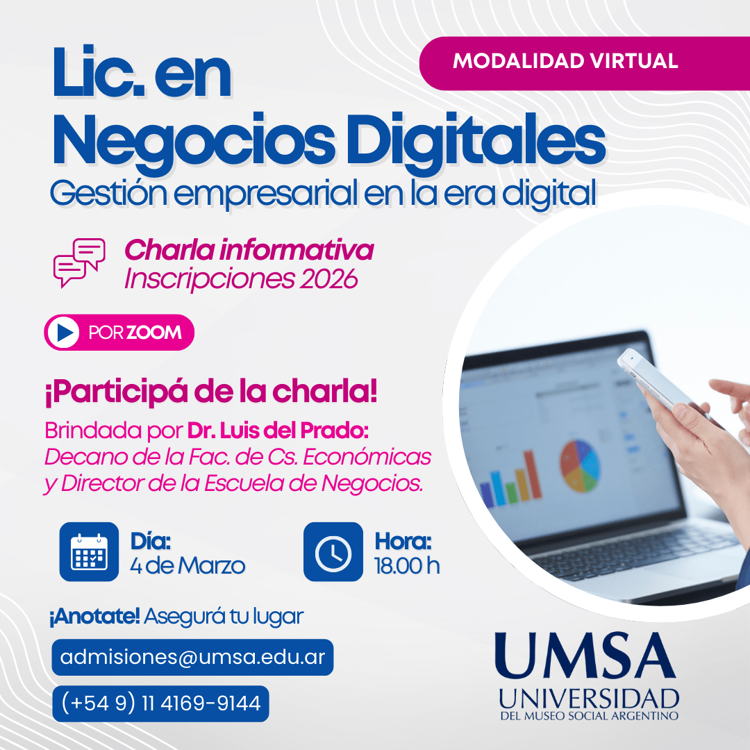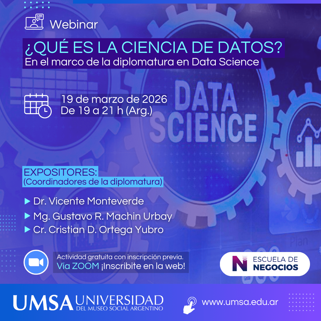 Webinar gratuito: ¿Qué es la Ciencia de Datos? La Escuela de Negocios de la UMSA invita al webinar “¿Qué es la Ciencia de Datos?”, una actividad gratuita organizada en el marco de la Diplomatura en Data Science. La ciencia de datos se ha consolidado como una disciplina estratégica para organizaciones públicas y privadas, permitiendo transformar grandes volúmenes de información en conocimiento útil para la toma de decisiones. Este webinar tiene como objetivo introducir los principales conceptos vinculados a la ciencia de datos, sus aplicaciones en el ámbito empresarial y tecnológico, y las competencias requeridas para desarrollarse profesionalmente en este campo. […]