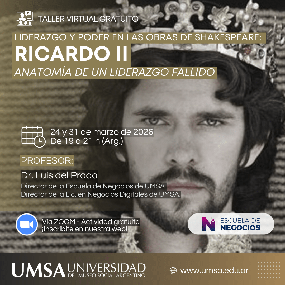 Anatomía de un liderazgo fallido La Escuela de Negocios de UMSA presenta este taller virtual gratuito orientado al análisis del liderazgo a partir de la obra Ricardo II de William Shakespeare. La propuesta aborda el ejercicio del poder, la legitimidad, la autoridad y las consecuencias de un liderazgo fallido, estableciendo puentes entre la literatura clásica y los desafíos contemporáneos del management y la conducción institucional. El análisis permitirá reflexionar sobre: 📅 Fechas: 24 y 31 de marzo de 2026🕒 Horario: 19 a 21 h (Argentina)💻 Modalidad: virtual – vía Zoom🎟 Actividad gratuita con inscripción previa Profesor a cargo:Dr. Luis del […]
