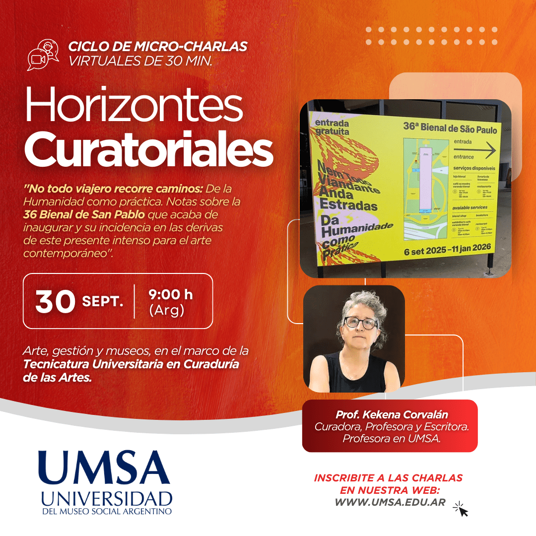"No todo viajero recorre caminos: de la humanidad como práctica. Notas sobre la 36º bienal de San Pablo que acaba de inaugurar y su incidencia en las derivas de este presente intenso para el arte contemporáneo". Arte, gestión y museos, en el marco de la Tecnicatura Universitaria en curaduría de las Artes. Prof. Kekena Corvalán - Curadora, Escritora y Docente de la Facultad de Artes de UMSA.