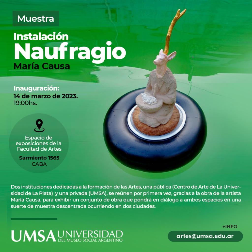 Dos instituciones dedicadas a la formación de las Artes, una pública (La Universidad de La Plata) y una privada (La Universidad del Museo Social Argentino), se reúnen por primera vez, gracias a la obra de la artista María Causa, para exhibir un conjunto de obra que pondrá en diálogo a ambos espacios en una suerte de muestra descentrada ocurriendo en dos ciudades.