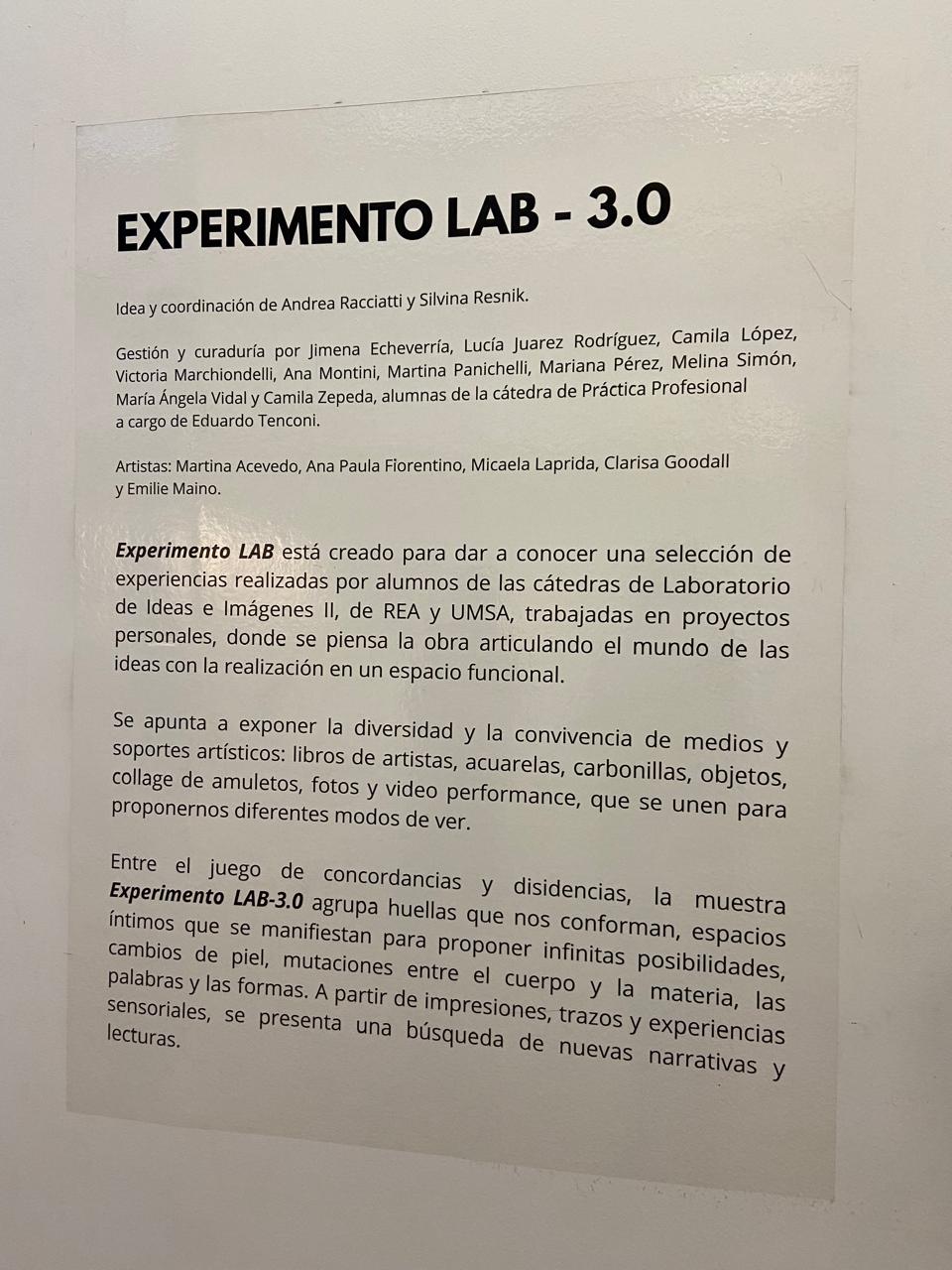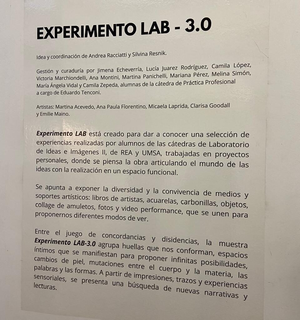 Entre el juego de concordancias y disidencias, la muestra Experimento LAB 3.0 agrupa huellas que nos conforman, espacios íntimos que se manifiestan para proponer infinitas posibilidades, cambios de piel, mutaciones entre el cuerpo y la materia, las palabras y las formas. A partir de impresiones, trazos y experiencias sensoriales, se presenta una búsqueda de nuevas narrativas y lecturas.