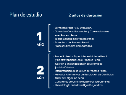 El posgrado se desarrolla en dos años, mediante un abordaje dinámico y actual de las orientaciones político criminales, los principios y las garantías, los diversos sistemas procesales con sus regulaciones específicas y las estrategias de litigación. Ello se da a través del permanente análisis de casos y de fallos. A su vez, la entrega previa de materiales de lectura actualizados y bien sistematizados, permite a los alumnos configurar un corpus de información esencial para su crecimiento profesional.